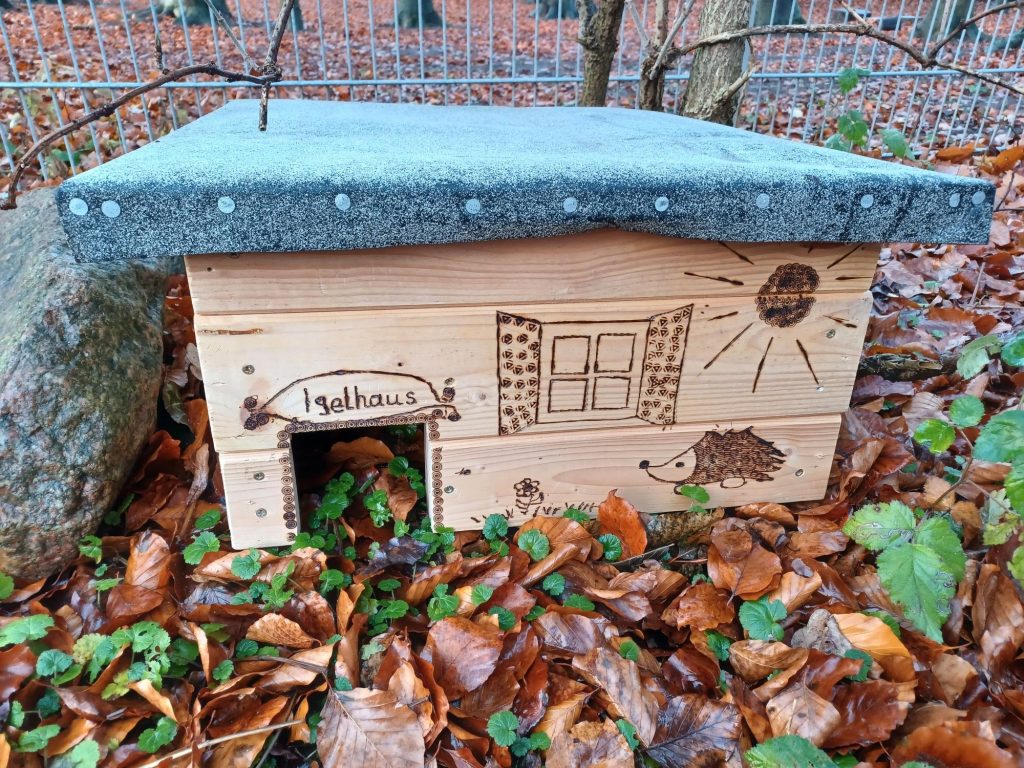 Die Holz AG im Drachennest hat ein Igelhaus gebaut. Es ist in unserem Garten aufgestellt und alle warten nun, dass ein Igel dort einzieht. Es waren viele Arbeitsschritte nötig, ein Bauplan wurde erstellt, das Holz zugesägt, geschraubt und ein regenfestes Dach aufgebaut. Natürlich wurde auch liebevoll gestaltet. Innen befinden sich zwei Kammern mit einem kleinen Durchgang.